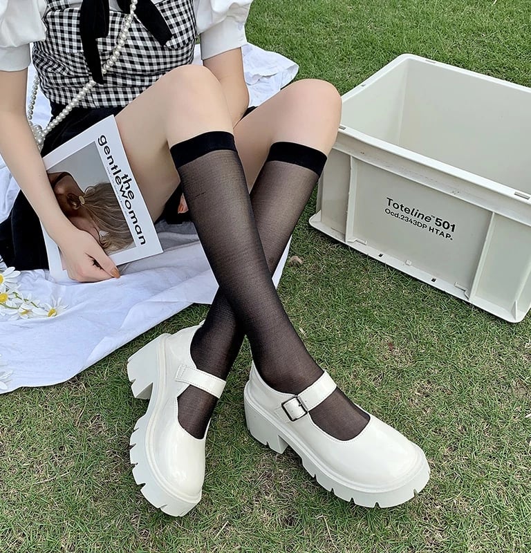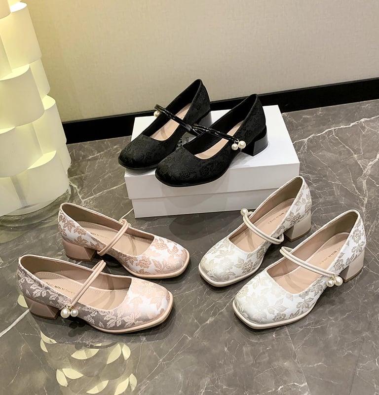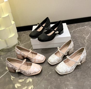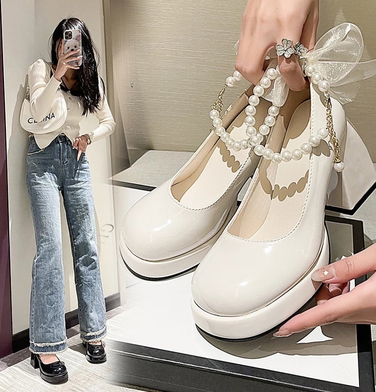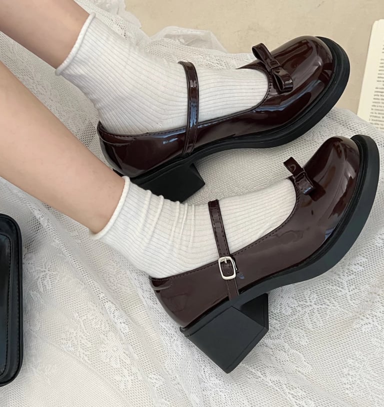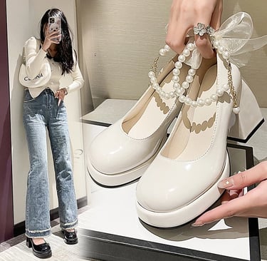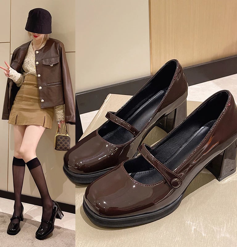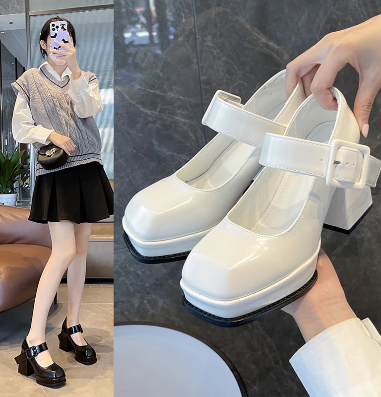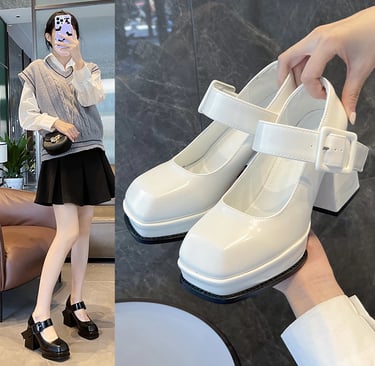 Sepatu Mary Jane Hak Tahu Wanita Import Murah Kulit Putih Hitam 6cm Chunky Block Heels